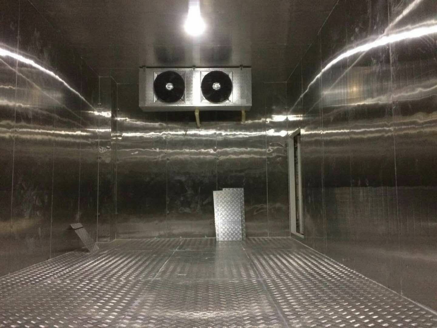 冷庫工程名稱: 湛江市金小小食品有限公司面包速凍冷庫 冷庫概況: 該速凍庫由廣州利鳴機械科技有限公司承建,冷庫庫容為30立方,儲藏產品:面包 產品尺寸:10cm*60cm*8cm,產品進庫溫度:常溫,冷庫速凍時間:90分鐘; 速凍后的產品中心溫度:-18度。 庫體采用雙面不銹鋼15cm聚氨酯冷庫板,機組采用北京比澤爾20匹雙級水冷機組, 冷風機采用高翔定制型DJ140水沖霜不銹鋼冷風機